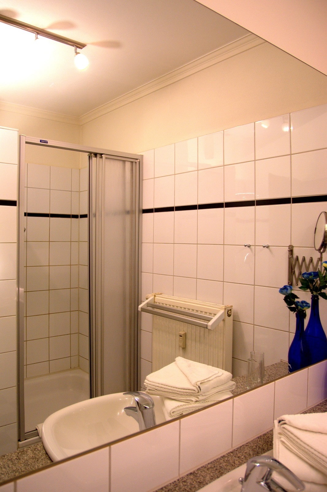 Das freundliche Badezimmer ist mit einer Spiegelwand, einem Waschbecken, einer Dusche mit geräumiger Duschkabine, Fön und