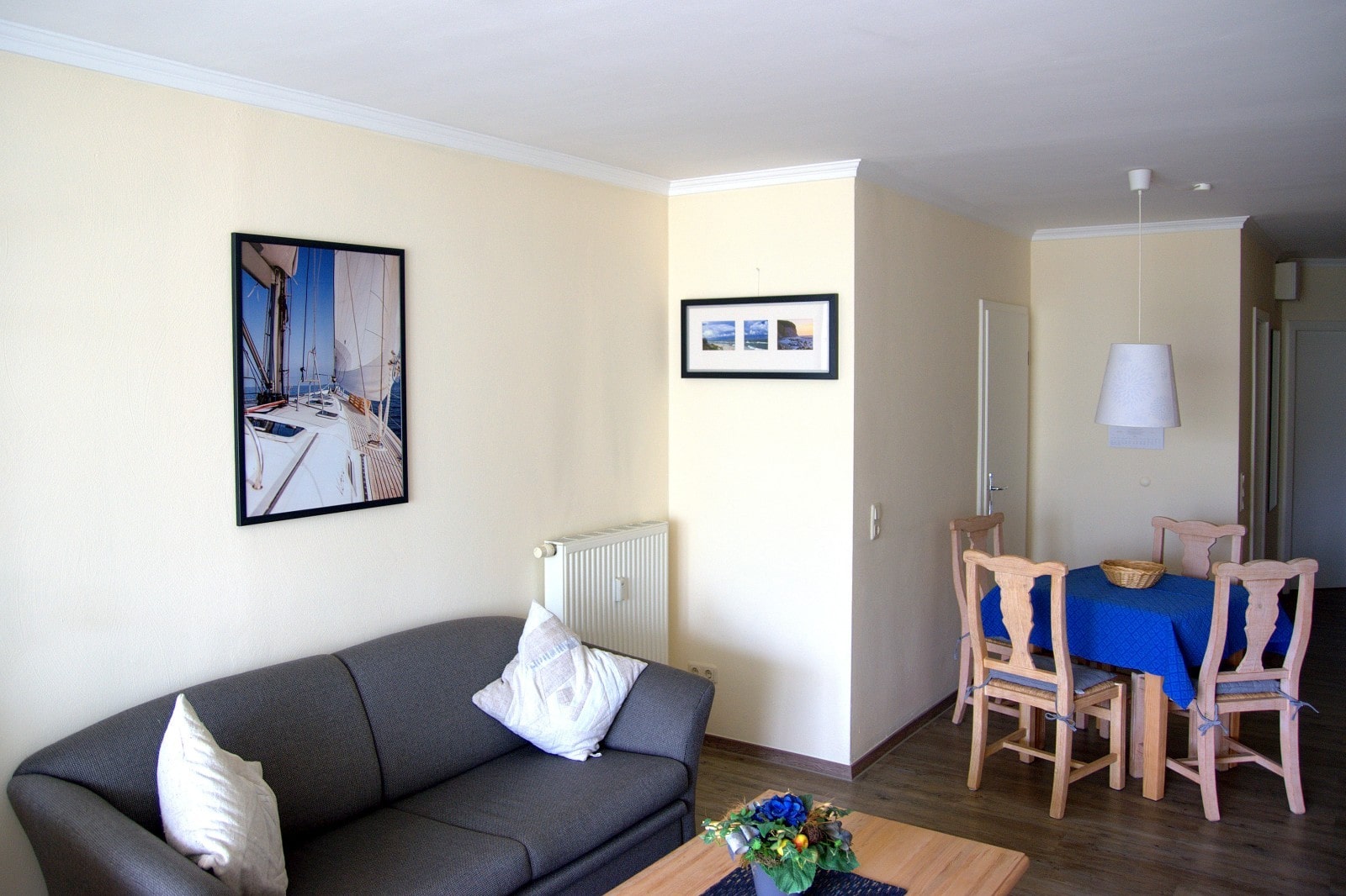 Das Ferienappartement selbst besteht aus einem großen, hellen Wohnzimmer mit breiter Fensterfront zur Loggia, einer Essecke mit